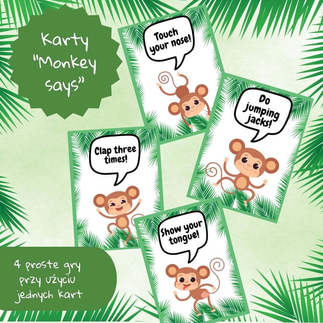 Karty Monkey says to karty pozwalające ćwiczyć proste komendy w języku angielskim, takie jak ”Clap three times”, ”Do jumping jacks”, ”Show your tongue”. Ta gra jest rekomendowana dla klas 1-3, ale sprawdzi się jako rozgrzewka nawet w starszych klasach. Zestaw zawiera 60 małpich kart z prostymi poleceniami.